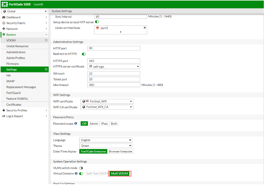 system -> settings -> System Operation Settings 의 Vitual Domains Enable -> Multi VDOM 선택